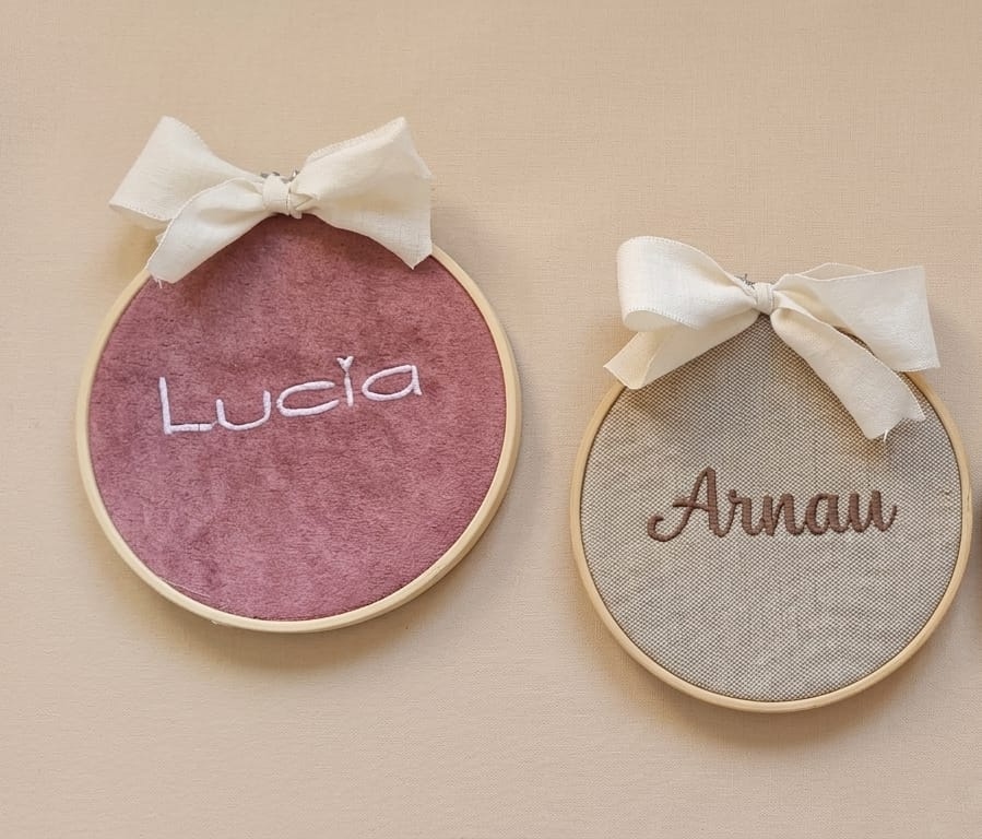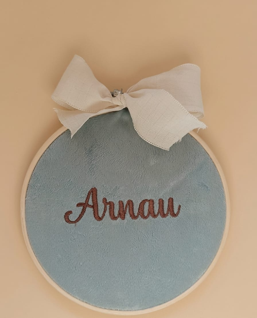 Bastidor con nombre bordado sobre tela. Diferentes telas a escoger.
