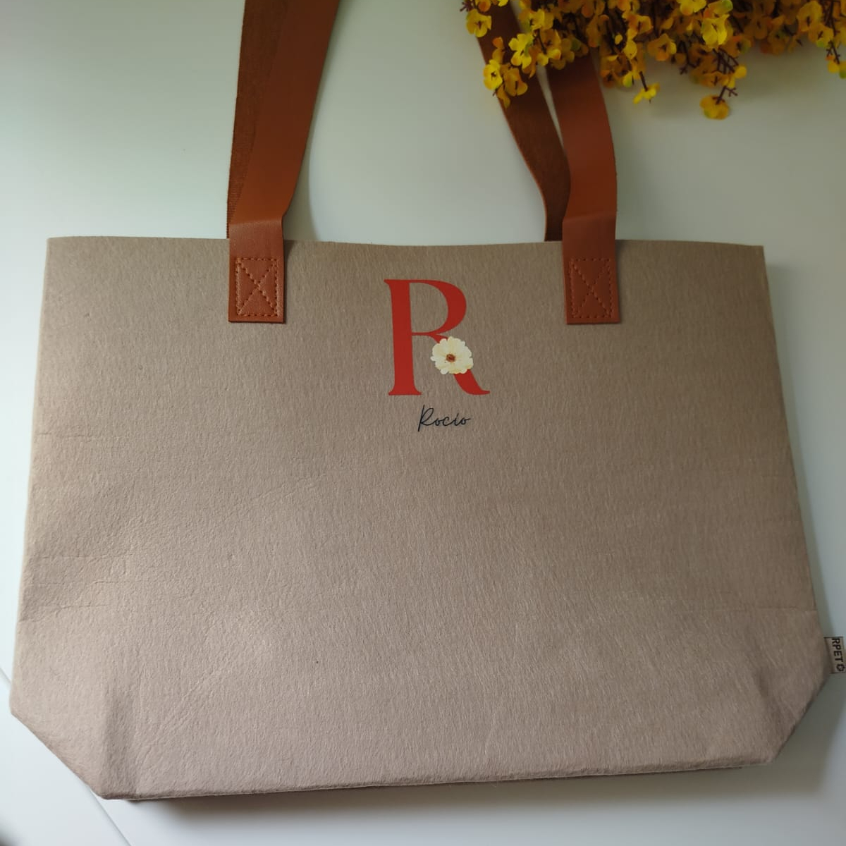 Bolso de fieltro personalizado con inicial y nombre en DTF o vinilo textil.