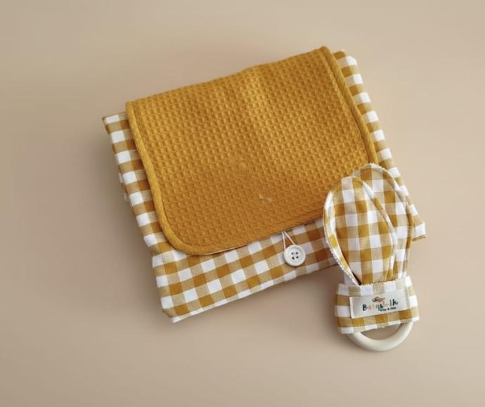 La higiene del bebé es importante, por eso, el cambiador portátil es uno de los accesorios que no puede faltar nunca en tú bolsa de paseo. No importa dónde estés, podrás cambiar a tú bebé de forma rápida y sencilla. Hecho a mano con la combinación de telas que más te guste. Además, puedes personalizarlo con el nombre para hacerlo aún más único y personal.