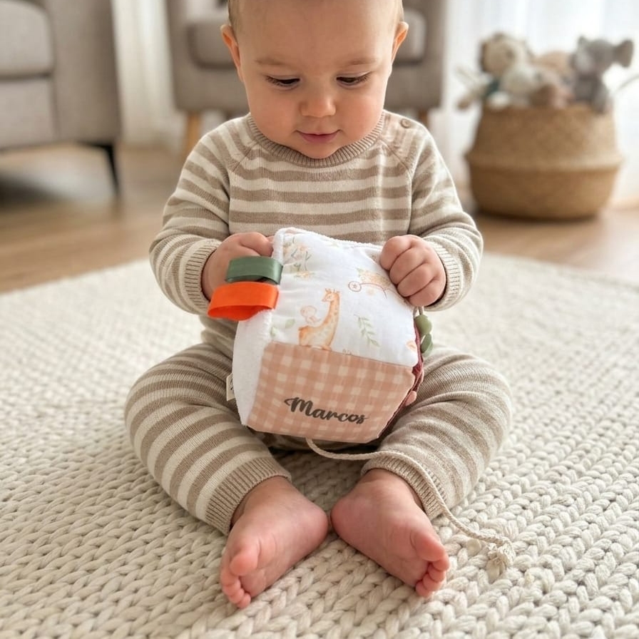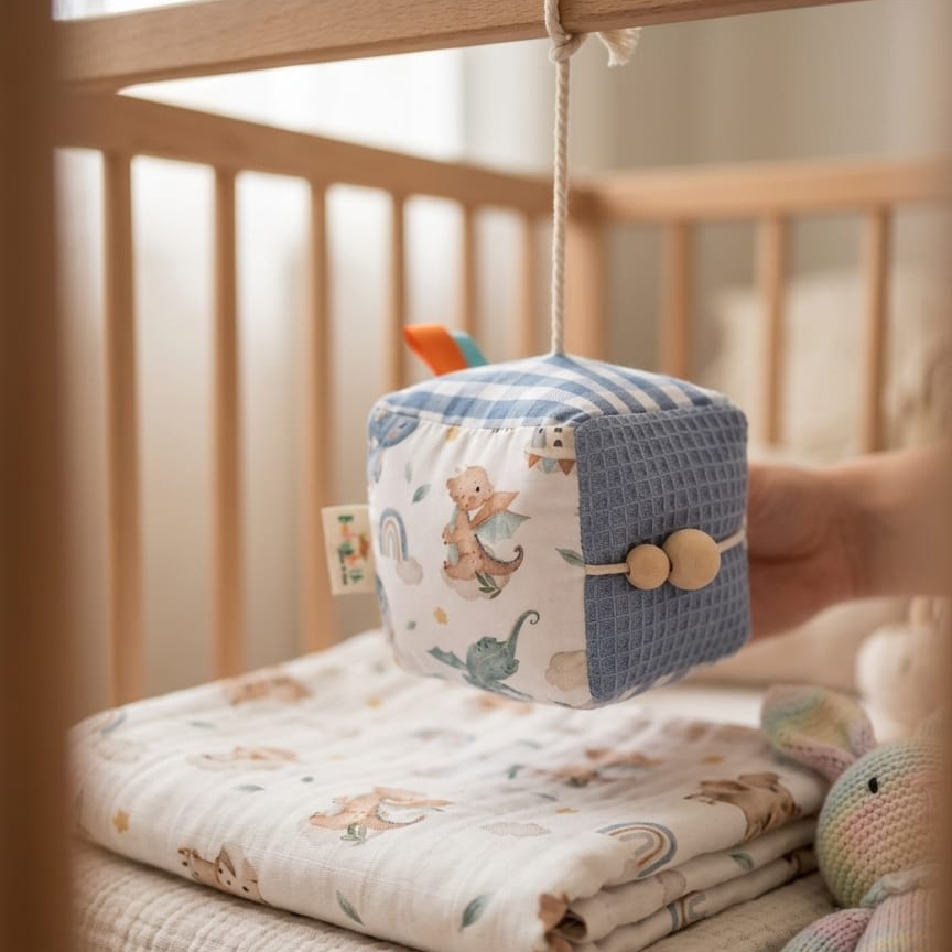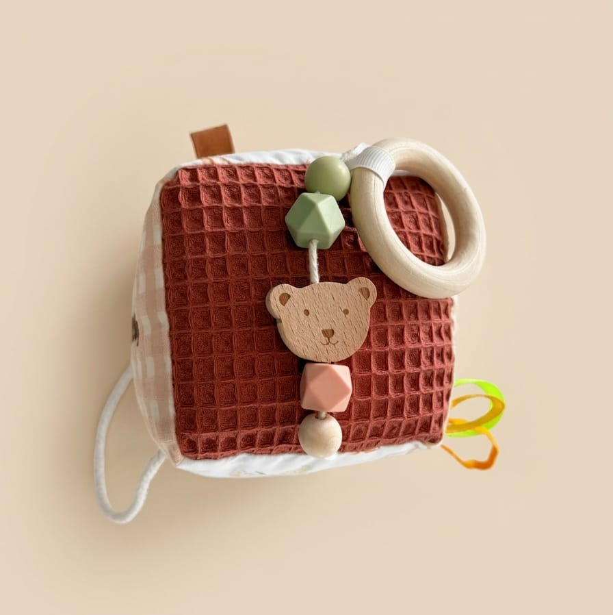El cubo sensorial es un recurso didáctico diseñado para estimular los sentidos y promover el desarrollo integral de los niños pequeños, por su capacidad para fomentar la exploración sensorial, la coordinación y la concentración. Está compuesto por diferentes telas y texturas. Además incorpora cintas y una tira con elementos de silicona o madera.