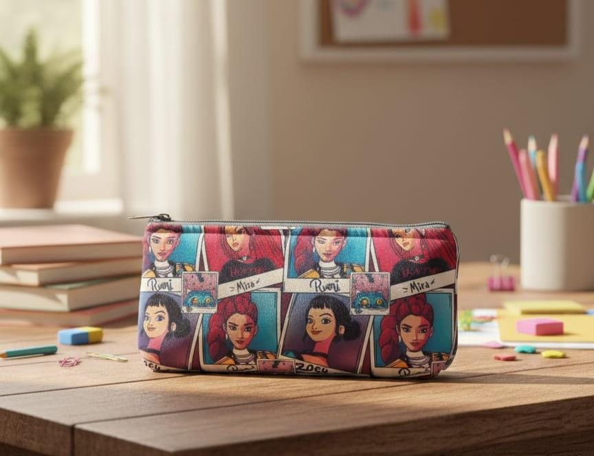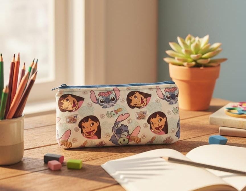 Estuche plano elaborado con tela de algodón y acolchado con foam. Gran capacidad interior. Cierre con cremallera.