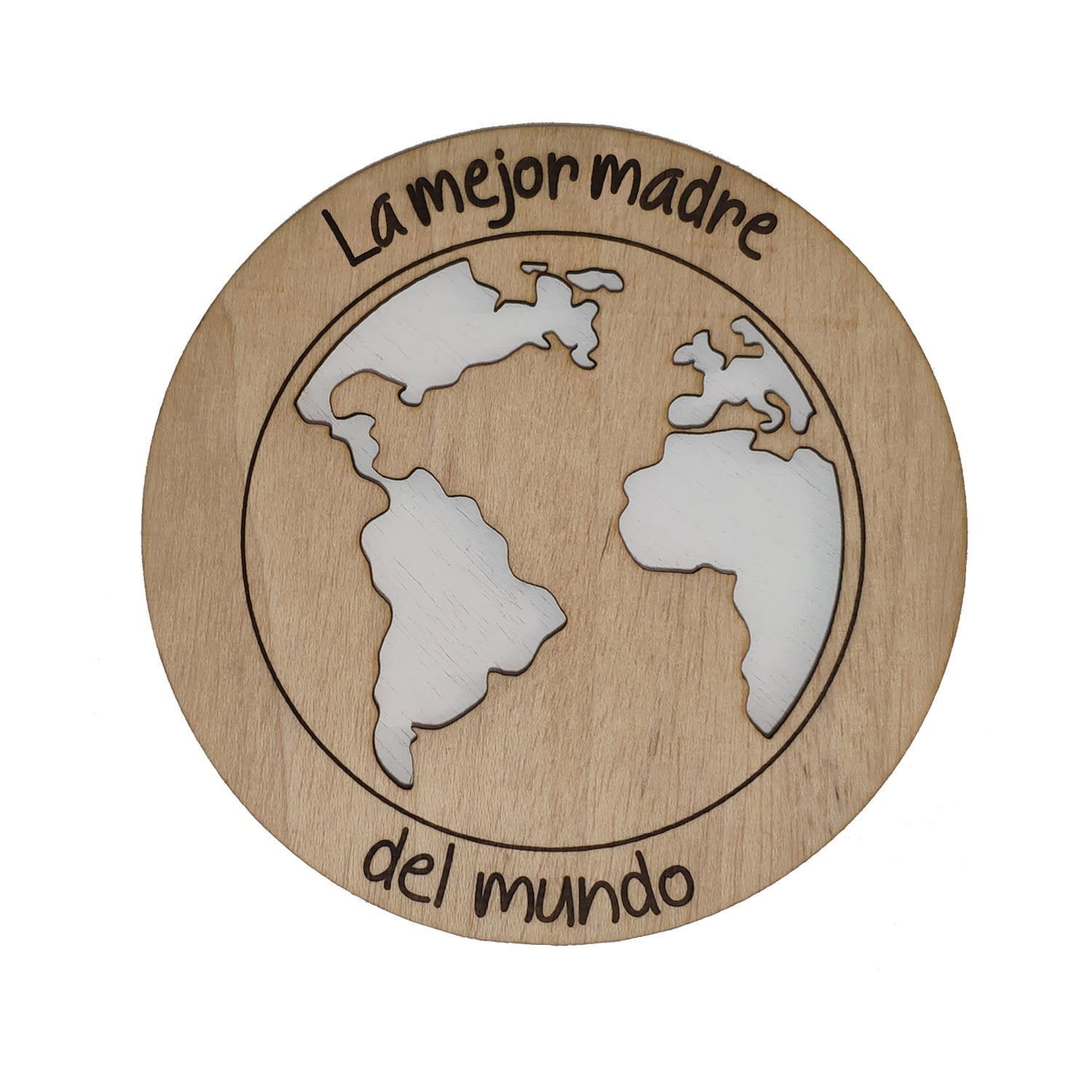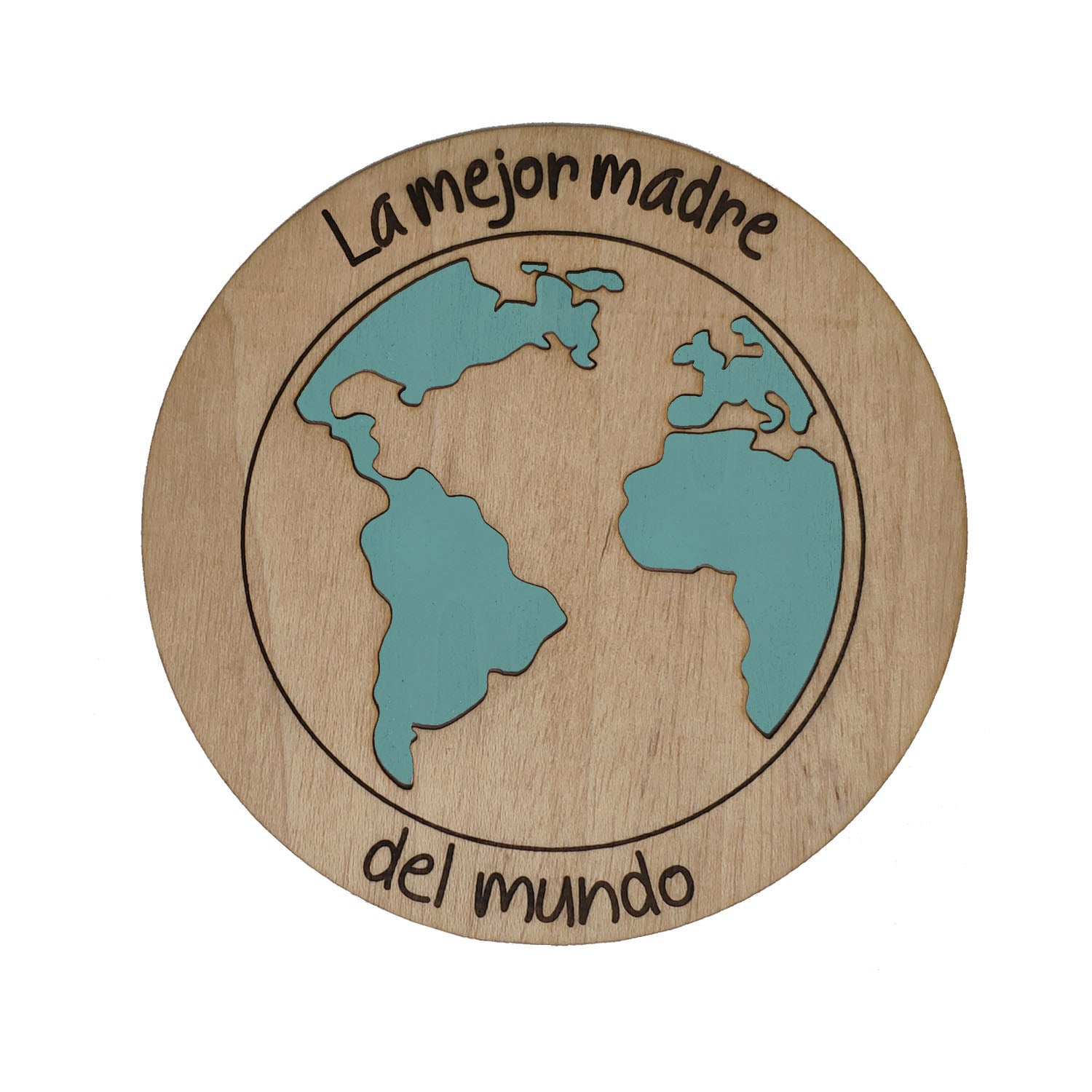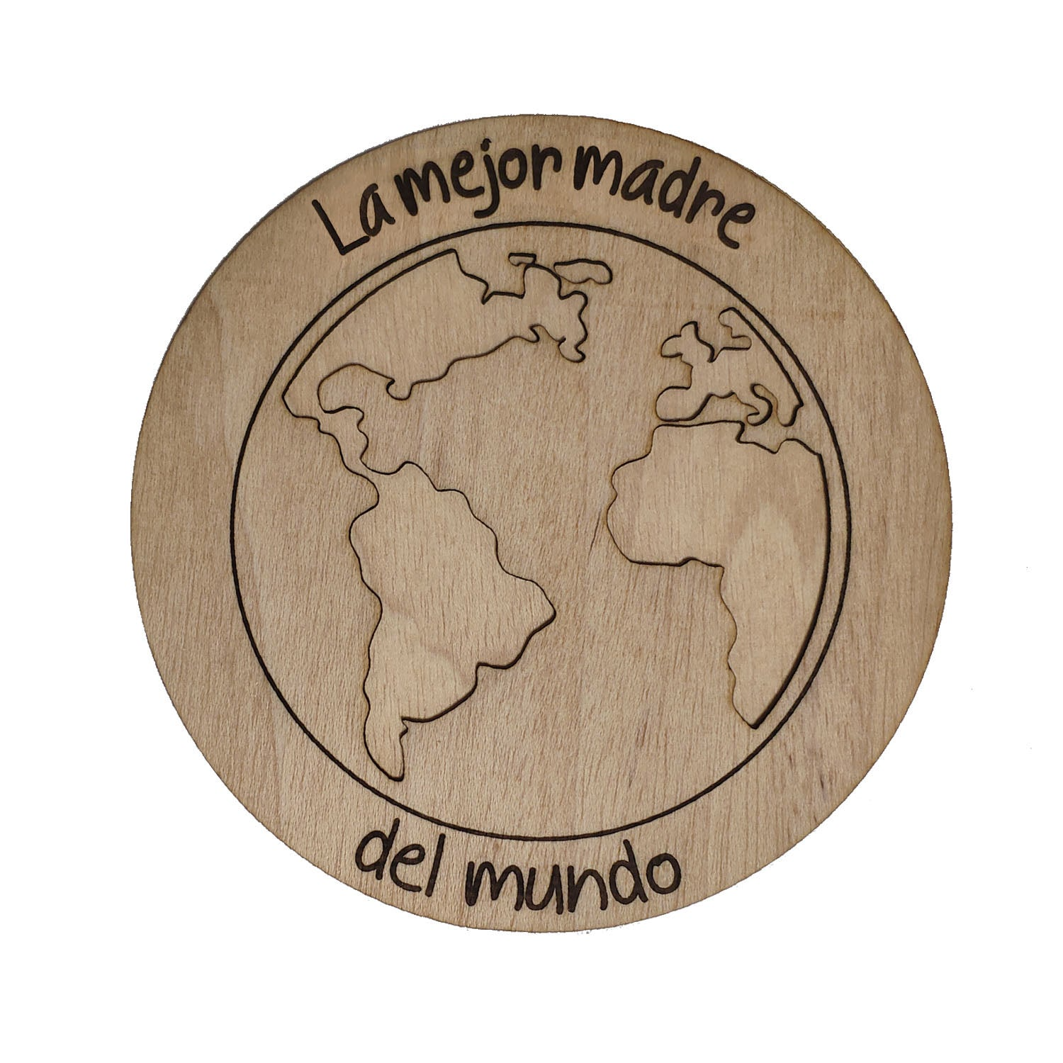 Cartel en madera natural con la frase "La mejor madre del mundo" en formato troquelado con los continentes.