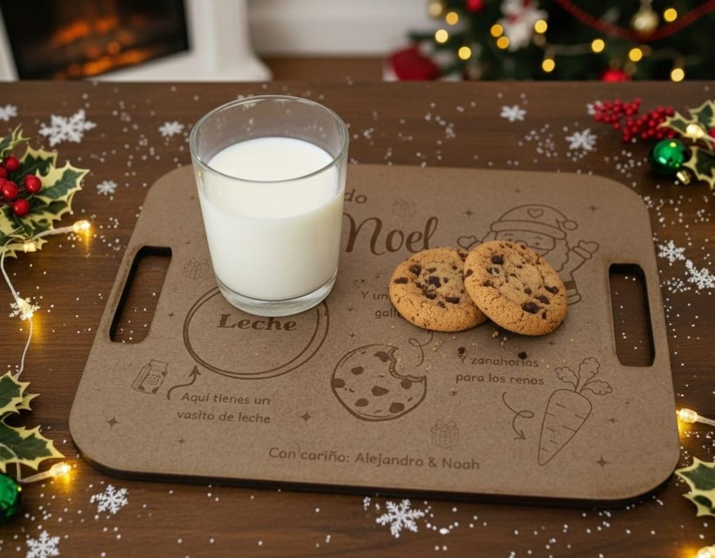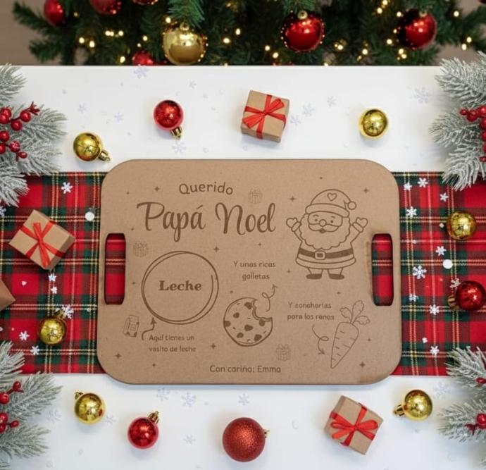Esta bandeja fabricada en MDF con grabado láser no es solo un objeto decorativo, es el centro de una nueva tradición familiar. Imagina la emoción en los ojos de tus pequeños al preparar la leche y las galletas para Papá Noel y Reyes Magos justo antes de ir a dormir.