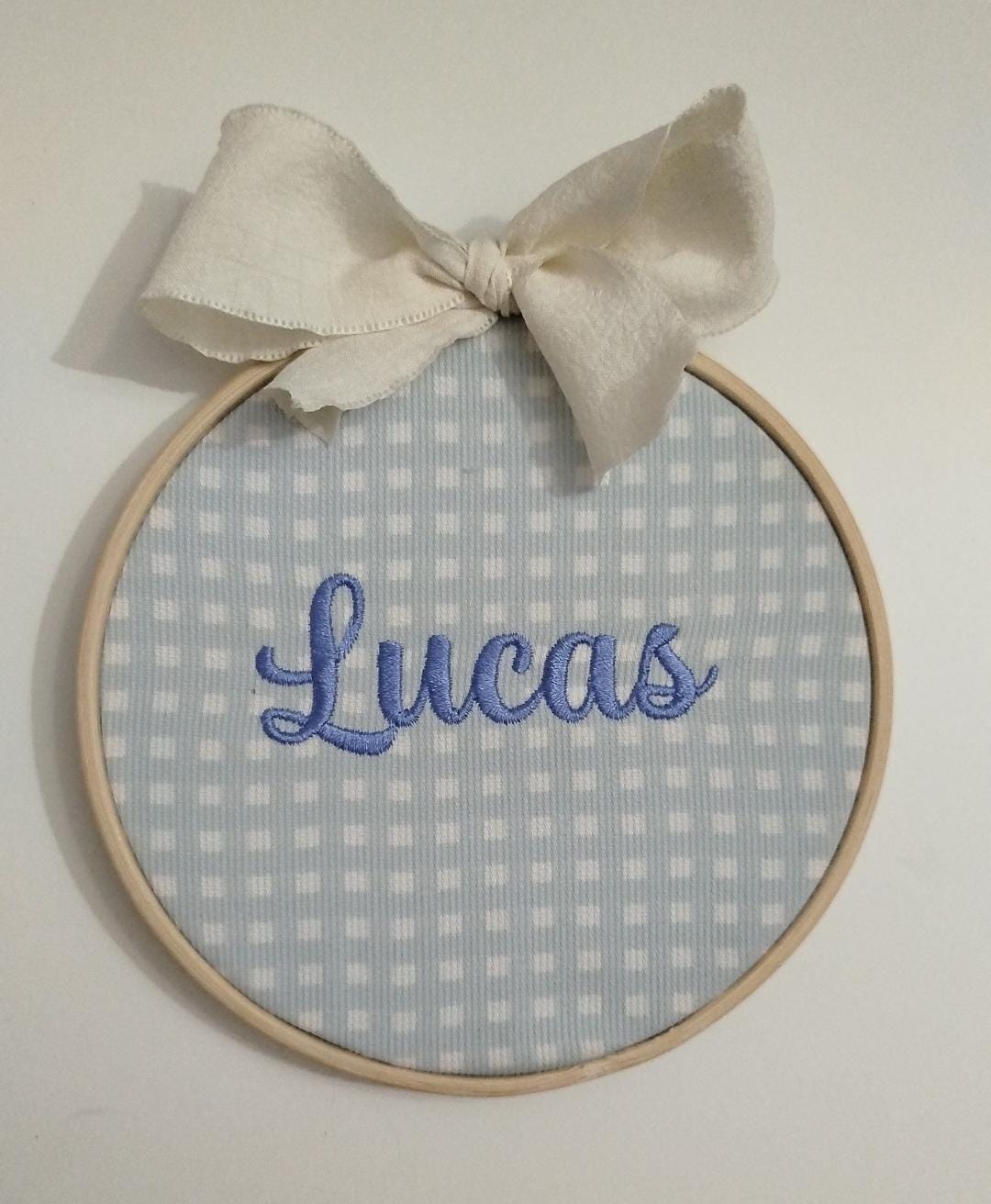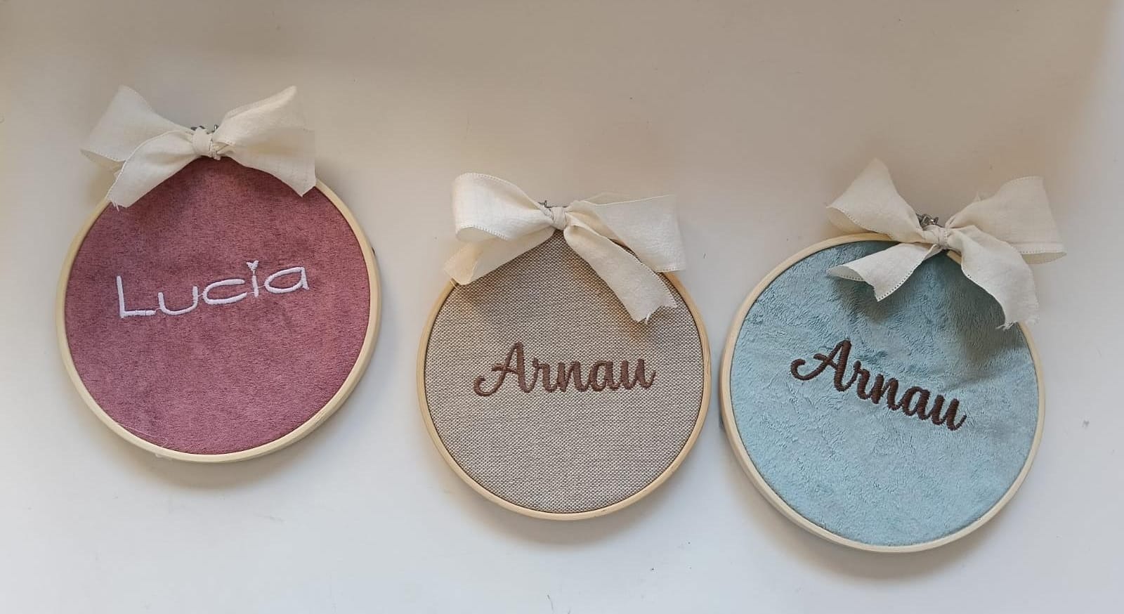Bastidor con nombre bordado sobre tela. Diferentes telas a escoger.