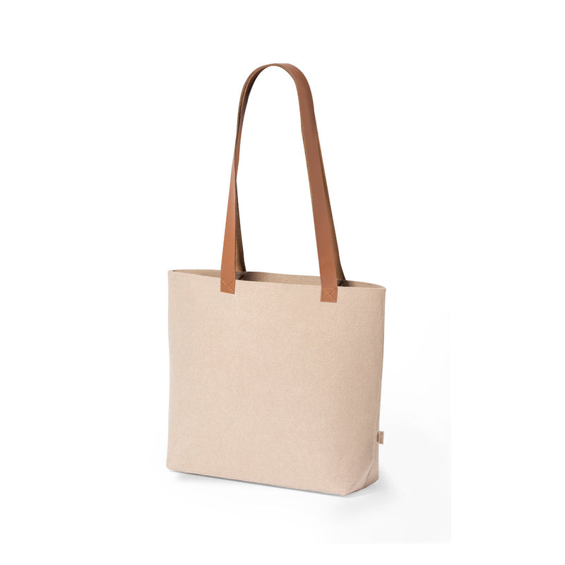 - Asas largas reforzadas (70 x 3 cm) en polipiel de tono marrón.