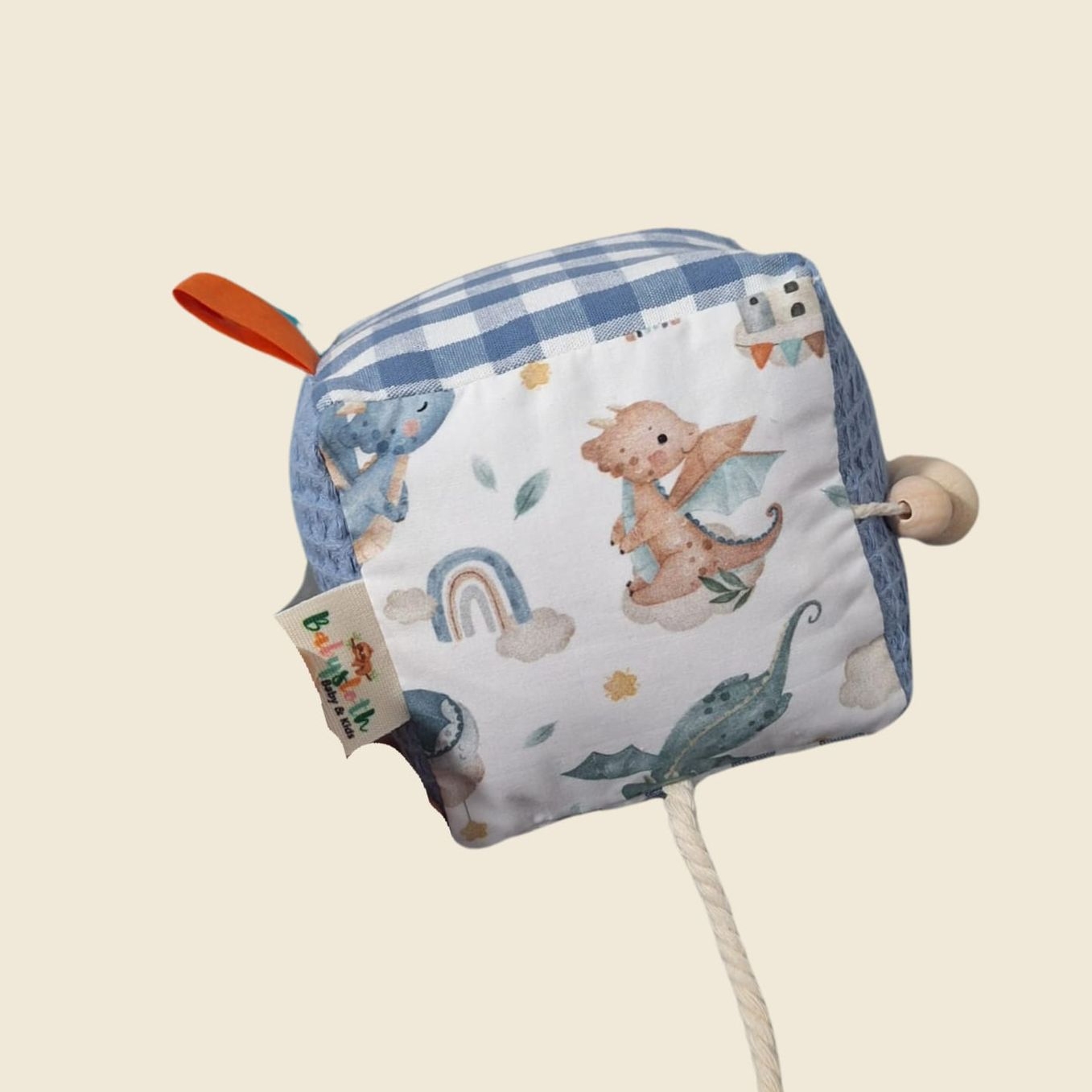 El cubo sensorial es un recurso didáctico diseñado para estimular los sentidos y promover el desarrollo integral de los niños pequeños, por su capacidad para fomentar la exploración sensorial, la coordinación y la concentración. Está compuesto por diferentes telas y texturas. Además incorpora cintas y una tira con elementos de silicona o madera.